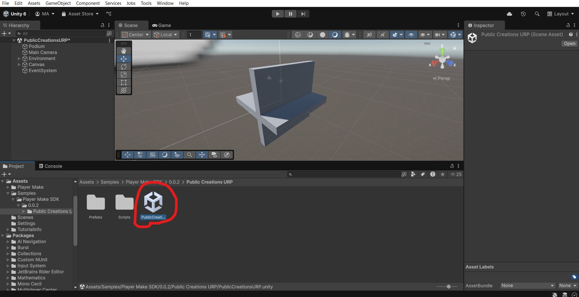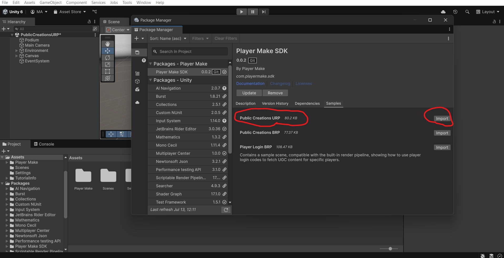 Click the import button as shown below, and import the Public Creations sample into your project for the specific render pipeline you are using (URP or BRP). This sample shows you the simplest Unity integration of Player Make.