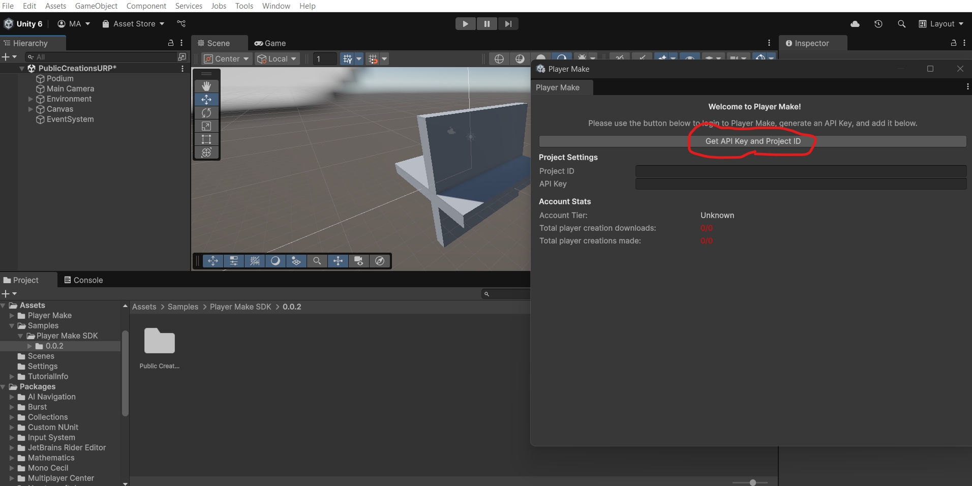 Inside Unity, from the top bar click on Tools > Player Make to open the Player Make setup window. Once it is open, click the 'Get API Key and Project ID' button to log in to your account (or create one) and to generate an API Key.