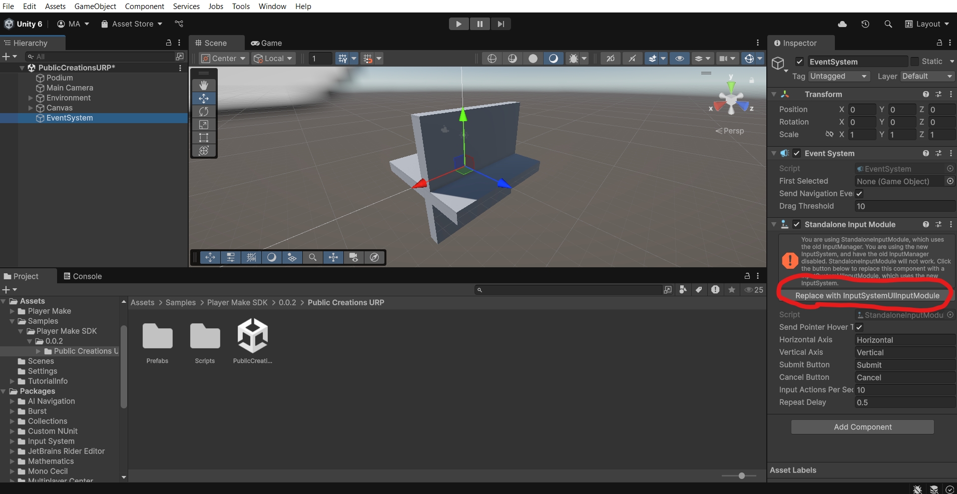 Click on the EventSystem object in the scene and click the 'Replace with InputSystemUIInputModule' button to upgrade to the new input system